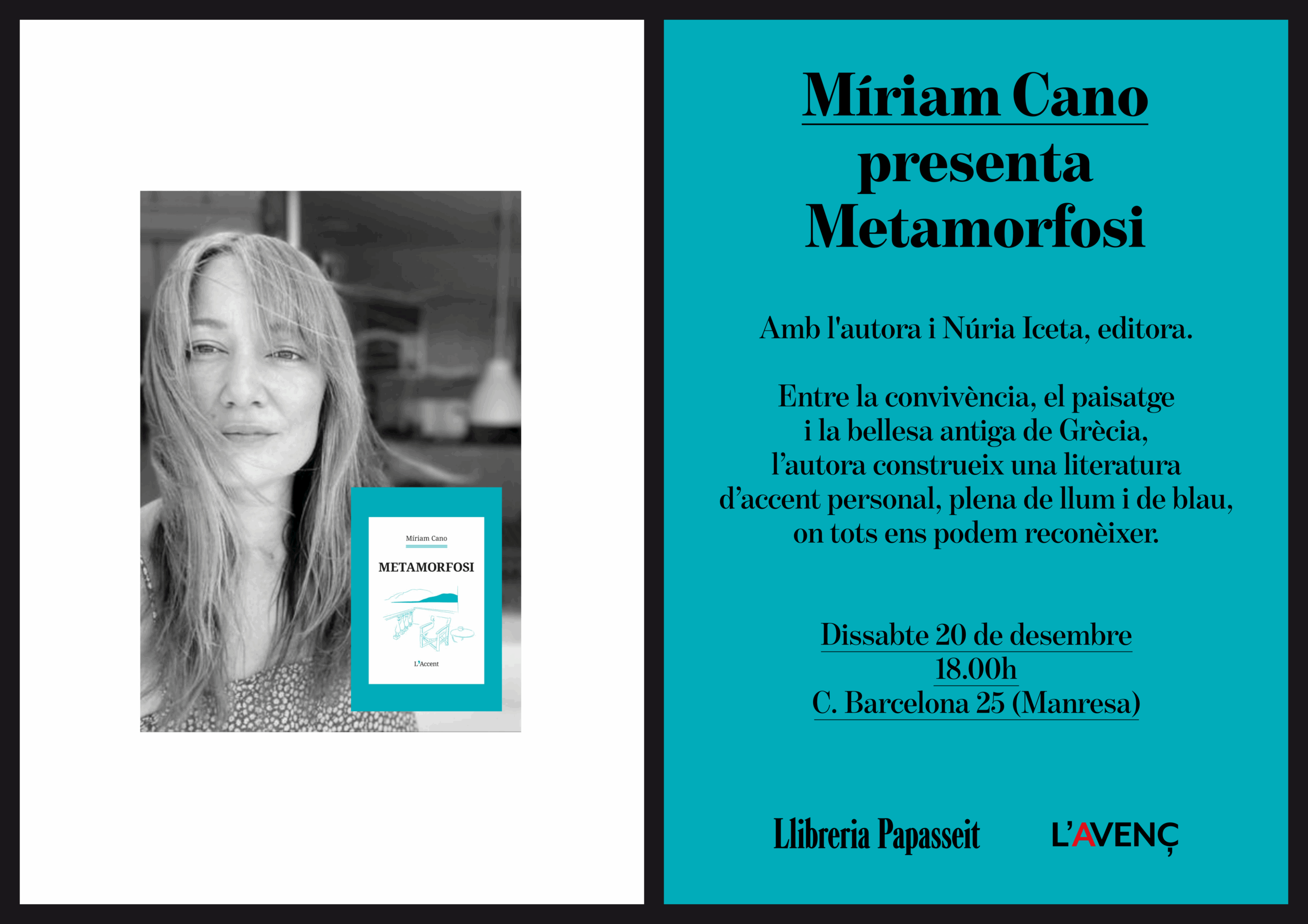 Presentació del llibre "Metamorfosi", de Míriam Cano. Amb l'autora i Núria Iceta, editora. Entre la convivència, el paisatge i la bellesa antiga de Grècia, l’autora construeix una literatura d’accent personal, plena de llum i de blau, on tots ens podem reconèixer.
