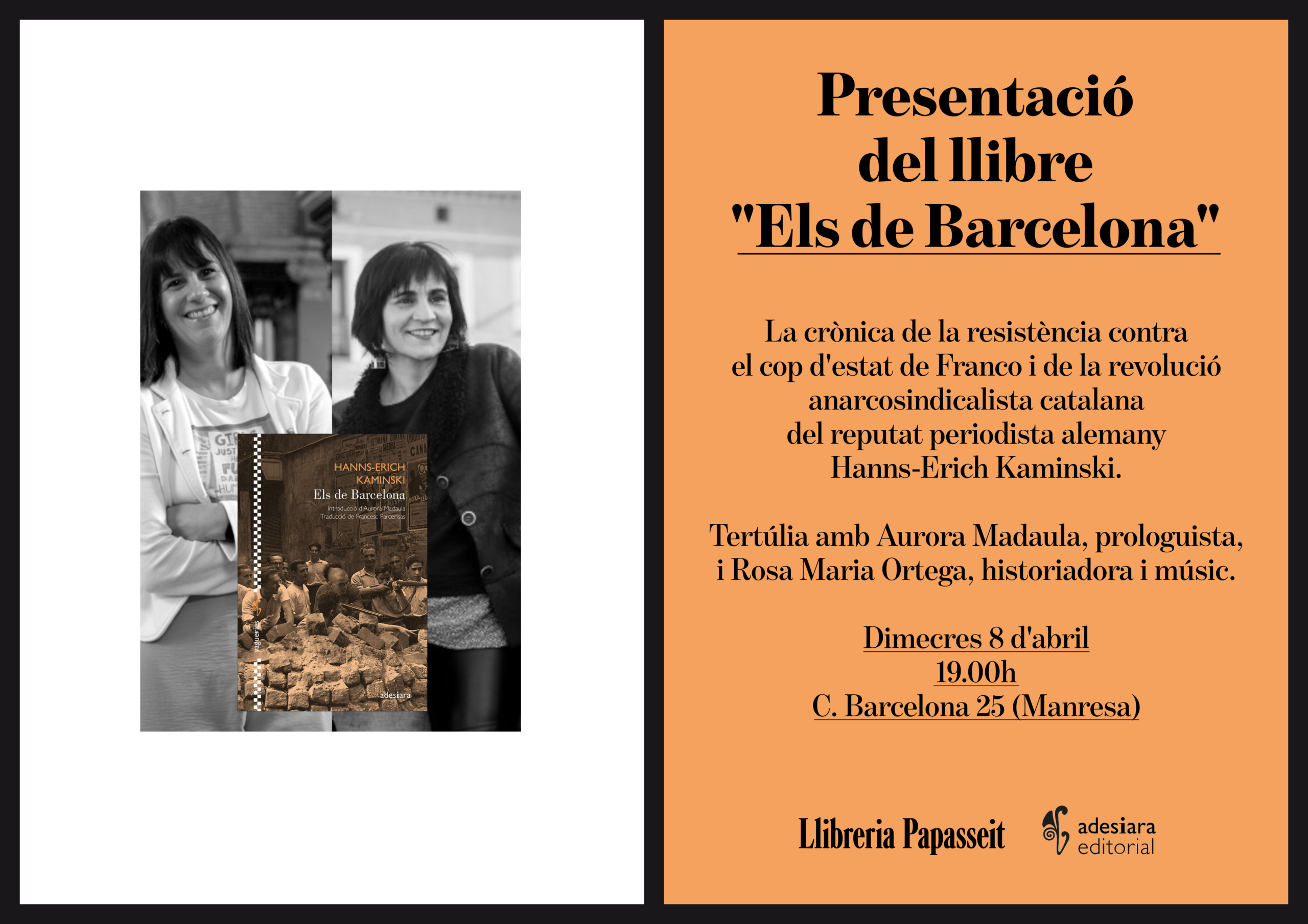 Tertúlia d'Aurora Madaula, prologuista, i Rosa Maria Ortega, historiadora i música sobre la crònica de la resistència contra el cop d'estat de Franco i de la revolució anarcosindicalista catalana del reputat periodista alemany Hanns-Erich Kaminski
